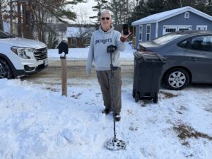 After dropping Cheryl off at home and loading my equipment up, I left for the Windham Maine Highland Lake area, arriving at 11:45am. I immediately took a photo, of the driveway and sent it to Kandy. I want to make sure I had the right property and not someone else’s. Kandy replied immediately and confirmed I had the correct property. The search area was not very large, at all. I was estimating 15-20 minutes to search the shoveled areas. I would start at the left front of the driveway, as you faced the house. I would search straight up the driveway and walkway, then turn and come down the right side of the driveway. As I started, I could see quite a few potential obstacles, in the way of large pieces of metal. While searching, large metal will mask the item, I am looking for. My metal detector cannot get within a foot or two of vehicle, lawn furniture, even houses, with aluminum siding. If the item I am looking for, is next to one of these sources of interference, I may not be able to find the item. As soon as I started, I saw a cyclone fence, lawn furniture and other metal objects. If I was unable to locate the phone, because of this metal, I would need to go back and use my pinpointer, sticking into the snow and hoping it picks up the phone. Let’s hope it doesn’t come to that.
