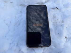 As I made my way along the cyclone fence, it really wasn’t interfering at all, except in the area, of the support posts, for the fence. So far, so good but still no phone. Next up was the path, to the shed and there was no interference and also no phone. I then made my way back down the path, along the house, with interference, but still no phone. I only had a 25-30 foot section of snow to search, from the corner of the house, to the mailbox. Approximately 1/2 way between the corner of the house and the mailbox, I received a very loud high tone, reading 96, on my VDI screen. I couldn’t see anything, so I continued swinging the coil, removing a little snow, from the area, with each swing. All of a sudden, I saw the side outline of something black, just like a phone. I removed a little more snow and verified that it was Corey’s phone. My first thought was, YES, I wan’t have to go back along the metal interference it’s and search manually, with the pinpointer. I then took a photo, of the phone, all covered in snow and sent it to Kandy. The entire search, from the timestamp on the photo I took and sent to Kandy, at the start of the search, to the photo I just took of the phone was just 18 minutes. Not to bad. I then called Kandy and she was so happy that Corey would be getting his phone back. Kandy arrived about 10-15 minutes and thank me again for coming out so quickly and expressed amazement that the phone was found and so fast. She told me that where I found the phone wasn’t searched throughly because Corey really thought it wasn’t lost in that area and most of the search effort was along the other areas. As you all know, if you aren’t sure where something was lost, it could be anywhere. Kandy then took a few photos of me holding the phone, as she preferred not be be all over social media. As I was leaving, Kandy was still all smiles, thanking me and was heading, into the house, to leave Corey’s phone inside. Later that afternoon, Kandy sent me a message