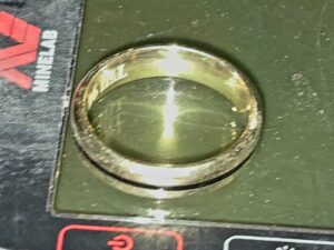 I arrived at the area, and made my way down to the pinned spot he had shown me in a satellite image. I marked the area and began a grid larger than he had shown to insure nothing was missed. I went pass after pass digging every tone to be sure. I found numerous pieces of trash metal, some with promising signals, but no ring. Then about 30 feet off the mark I received a good strong signal, dug, and had his ring. I took a picture, and told him I found it. I was in the process of writing to find out when I would be able to make the return when Jared told me that he and his wife were having dinner just 5 miles up the road on my way home. I let him know that I would meet him in the parking lot, and was on my way. When I got there he was outside waiting in disbelief that this all happened to get his ring back, and he told me he had only been married 2 months. How exciting is that!