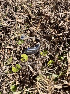 Randy called me after losing one of his very expensive hearing aids. Apparently while out walking his dog…along came one of his neighbors with their own dog and the two dogs got into it! In the midst of the chaos Randy felt one of his hearing aids come off of his ear and he tried to reach for it but it fell into the darkness and landed somewhere in the short brown grass. The next day I met Randy and he showed me the area where he lost his hearing aid. I set out four plastic cones and began my systematic grid search…overlapping on each pass to be sure I would not miss such a small target. (Randy had his other hearing aid and my metal detector was able to get a decent signal off of it so I had a really good idea of what sort of signal and the exact numbers to concentrate on…which really helped allot!) About 20 minutes later I got the signal I was looking for and I called Randy over and let him retrieve his lost hearing aid.