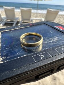 Now for the rest of the story. As I was taking photos of the first ring, Allen told me his wife had lost another ring that same day, that was why she ask him to hold the remaining ring. They believed the first ring was probably in the surf. I suggested that I take a few minutes to scan the area before leaving. 15 minutes later I found the first ring near where his wife had been playing volleyball.