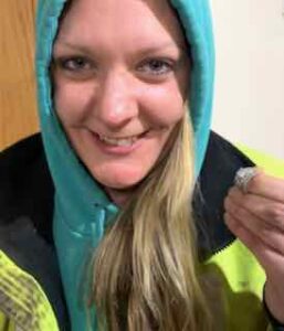 As I made my way along the cyclone fence, it really wasn’t interfering at all, except in the area, of the support posts, for the fence. So far, so good but still no phone. Next up was the path, to the shed and there was no interference and also no phone. I then made my way back down the path, along the house, with interference, but still no phone. I only had a 25-30 foot section of snow to search, from the corner of the house, to the mailbox. Approximately 1/2 way between the corner of the house and the mailbox, I received a very loud high tone, reading 96, on my VDI screen. I couldn’t see anything, so I continued swinging the coil, removing a little snow, from the area, with each swing. All of a sudden, I saw the side outline of something black, just like a phone. I removed a little more snow and verified that it was Corey’s phone. My first thought was, YES, I wan’t have to go back along the metal interference it’s and search manually, with the pinpointer. I then took a photo, of the phone, all covered in snow and sent it to Kandy. The entire search, from the timestamp on the photo I took and sent to Kandy, at the start of the search, to the photo I just took of the phone was just 18 minutes. Not to bad. I then called Kandy and she was so happy that Corey would be getting his phone back. Kandy arrived about 10-15 minutes and thank me again for coming out so quickly and expressed amazement that the phone was found and so fast. She told me that where I found the phone wasn’t searched throughly because Corey really thought it wasn’t lost in that area and most of the search effort was along the other areas. As you all know, if you aren’t sure where something was lost, it could be anywhere. Kandy then took a few photos of me holding the phone, as she preferred not be be all over social media. As I was leaving, Kandy was still all smiles, thanking me and was heading, into the house, to leave Corey’s phone inside. Later that afternoon, Kandy sent me a message