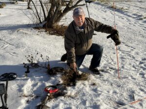 This morning, December 11th, 2025, Gary and I headed to York, Maine. We arrived at just before 8:00am and was promptly met by Deanna. She showed us the area and then had to head into work. Gary and I immediately got to work and went to find Pin #1, in the front of the house, along the fence. This pin was found within 1 minute and we now had a property pin, to measure from and down the road, 380’, to Property Pin #2. This is one of the must find pins, that Deanna wanted us to find. So, Gary and I retrieved the 300’ tape measure and looped it around Property Pin #1. I then walked it down the road 300’ and marked it, at that point. Gary brought the tape up to the 300’ mark and we measured out another 80’. We should now be able to locate Pin #2, in the vicinity. Using a tape measure isn’t as accurate as GPS, now used by surveyors but it will put us very close, to within a foot or so. Gary and I started searching and our first target looked promising. A definite piece of iron, ringing up in the ferrous range. As we dug it, it turned out to be a large spike, from a long, long time ago. As we continued the search, our second target was also a ferrous target and after digging it, we had found what we were looking for. Property pin #2, had been found. Deanna had given us some orange stakes, to place next to the property pins. This pin was a pipe, as was Pin #1 and we placed the orange stake, right into the pipe. This Pin #2 was within a foot of where the 380’ measurement came to. I love it when it works out like this. Now on to Property Pin #3. A must find, for Deanna. Gary and I then measured approximately 102’, into the field and Gary noticed an iron rebar rod, sticking out of the ground, at just about the area, we would be searching in. We dug around the rebar and saw that the rebar had actually been placed, inside a pipe, like the one we had just found, up near the road. This was to easy, so we searched the area, for anymore property pins, but found absolutely nothing. Fantastic!!! Property Pins #1,2 and 3 had been found. Now let’s see if Pin #4, is findable. Deanna had told me that she thought Pin #4 may be in amongst some trees. Only one way to find out, Gary and I measured the 85’ and because it is being measured, at an angle and not a straight line, from Pin #3, we had a slightly larger area, to search. Some of the area, as you got close to the trees, were difficult to search, because the hay was fairly tall and we couldn’t swing the metal detector, very well. This area also has what looks like some sort of small path, for farm equipment or ATV’s. The path area was frozen and difficult to dig. The area also was producing a lot and I mean, a lot of large ferrous targets. We were digging up large iron pieces of old farm equipment. Could these pieces of iron, be masking out, the much smaller iron Property Pin? We did find a large iron Pin but we are not sure if it is the Property Pin. It was found 4’, short of where it should have been found. Gary and I think it may have been part of a fence, at one time. We had been finding fence wire in the area, so kind of makes sense. We decided to call it a day, due to the difficult circumstances and return, in the spring, once the ground thaws, on the path and the hay will be flattened, from this winters snow. I am sure we will find Pin #4, in the spring. I sent Deanna a message about finding 3 of the four Property Pins and two of the pins, were the ones, she really wanted, to have us find. Gary and I were happy to have found the three and were really happy to be getting out of the brutal windy conditions. We now have something to look forward to, this sprig and Deanna is extremely happy to finally know where the Property Pins are.