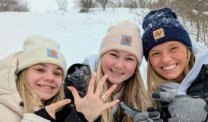 ydney sent me a text this morning saying she lost her oura ring last night while sledding down a hill on campus after midnight. They went out there this morning searching for the ring again but came up empty. I met her and her friends at the site and she said the oura app showed the ring on the hillside this morning. While searching she brings up the app again and it says her ring should be in the area she is standing. I start to move toward her and she looks down and sees her ring laying upright in the snow. Sometimes you just get lucky! That is one happy trio!!