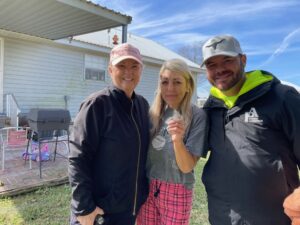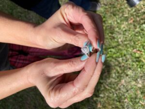Charissa was trying to get her cat out of a tree in her back yard. Shaking a branch did not work so she climbed in the tree and finally was successful. After getting back on the ground, she realized her diamond ring was not on her finger. She looked for it around the tree without luck. We then got the call for help. We had her describe where she had walked in the yard and climbed in the tree before she noticed the ring was gone. We hunted the area for about a half hour before Carrie found it. The odd thing was, we both had searched that area before Carrie located it. The area was where she had held onto a small branch and shook it in an attempt to scare the cat. As hard as it is to imagine, did the ring get stuck on that branch and fall after we had both made a first pass through that area? Either that or we’re really not that good.
