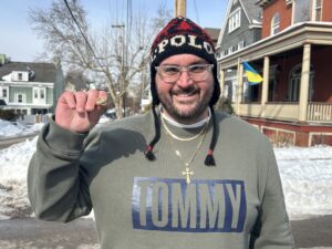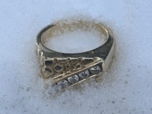 When Desh arrived we walked the area before I got my metal detector out of the car. The search area was about half a block when you consider where his car was stuck and where he walked to borrow and return the shovel. As I always do…I asked where he felt that the ring most likely fell out of his pocket. He felt confident it most likely fell out in the area of the street where the car was stuck. He said he was on his hand and knees digging in that area. We walked over there….it was dirty snow…2-3 feet deep in places where the plow came through. It was variable in depth because of cars driving through with big snow boulders here and there. I told Desh and his friend that I need to be able to sweep my metal detector so the area needed to be flattened out. The peaks and troughs are going to make it impossible for me to effectively scan the area. He and his friend began working with shovels to smooth it into a flat surface. The metal detector I was using would, at best, pick up a gold ring to a depth of 15 inches. It is a new and amazing machine featuring Bluetooth headphones to alert me to potential target signals. I was 10 minutes into scanning the area when I received a strong signal in my headphones. The signal identification number on the machine was suggestive of gold. Could it be? The signal came from a huge boulder of icy snow. Desh and his friend surrounded me in anticipation. I kicked the big ball and broke it in half. Now I was getting the signal from one half. I kicked that half and it broke into 2 pieces again. Again I was getting a signal from one piece. I kicked again and it broke into 3 apple sized snowballs. I scanned the 3 and was still getting a good signal from one of the snowballs. I picked it up and handed it to Desh. I told him something was in it. I was watching Desh intently as he gently broke the little snowball into smaller pieces. As I watched Desh choked and his eyes welled up with tears. He couldn’t speak for 30 seconds. Then he finally got the words out…you found it!!! Divine intervention? I’m not sure. I know this recovery will go down as one of the most meaningful for me for sure. Not just because it was so unlikely I was going to find it but because how much this ring meant to Desh. Over the next 10 minutes Desh welled up with tears 3 more times while sharing the history and significance of the cherished ring that I’m proud to say is back on his finger where it belongs.