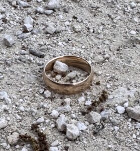 Once Mike arrived, I showed him the area and detected the snowbank, a fifth time and still no ring. I even put a test ring, in the snowbank and showed him the detector picks it up every single time. Terrie’s ring just wasn’t in the snow bank. Mike then texted Terrie with the news and a photo of the areas I had searched. Terrie replied that the snowbanks didn’t look as big, as she remembered. She then told Mike that maybe she had been at the other end of Friar Tuck Road. So, Cheryl, myself and Mike drove down Friar Tuck Road Loop a a few minutes later, arrived at the other end of Friar Tuck and Kings Highway. The first thing I noticed was that the snow banks were higher, so let’s go. Mike was performing a visual search of the road and snowbank. I was metal detecting the snow bank along Friar Tuck and the around the corner of Kings Highway. No Ring was found. I climbed over the snowbank and stated searching that side of the snowbank. Nothing found, as I made my way to the corner of Friar Tuck Road. Mike was still visually searching maybe 30 feet up Friar Tuck Road. I made it to the corner, swinging the coil and as with every search, I was also searching the area, with my Twin Optical Scanners. As I approached the telephone line, I finally heard the tone, I had been waiting for. A very loud low tone, that got my attention and I quickly glanced at the VDI Screen. It was showing 18-19. A low conductive number and right in the gold and platinum range. I looked down at the top of the snowbank and there it was. An engagement ring, Terrie’s ring. I looked over at Mike and said, “I got it”. Mike said something I couldn’t quite make out but I could certainly make out the very large smile, on his face, as he hurried over. I had left the ring alone, so Mike could see it, for himself. He thanked me, shook my hand and after a video and a few photo’s were taken, Mike picked the ring up and thanked me again, for staying to search both areas and for sorry it had taken so long, because of the mixup, on locations. Hey, it happens and this is why I prefer the client be there and show me the exact area, they had been in. Unfortunately, it just can’t happen the way we would like. Anyways, the ring was recovered and returned, after just a 5 minute search, at the correct location. Cheryl, Mike and myself had great big smiles on our faces, another ring would soon be back on the finger. I love my job. It’s the best job in the world.