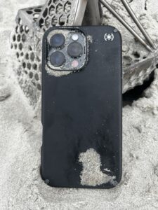 I arrived on site and took and sent him a video to make sure I was in the right spot. He replied that I was, so I started a perpendicular grid line from the top of the beach to about knee deep in rough surf. I knew an IPhone rings up crazy, anywhere from high 20s to mid 30s on the Equinox 800 VDI (visual display indicator). I think I was on my 6th grid line and got the high signal (34) I was looking for. It took me 3 scoops of wet sand to get to his phone, but I got it. I tried turning it on with no luck. I was concerned the phone may have been under too much water to work. I took a couple of pictures of his phone and sent him a text saying, “This it?” He immediately called me and confirmed it was his. We discussed how to get it back to him in Charlotte, NC the fastest way possible. I told him I’d go to the Post Office and call him back. I took my equipment and his phone back to the car and decided to get one more picture. I walked back down to the beach just in time to watch a guy with a detector walk within 2 feet of where I had found Luke’s phone. Glad I found it first. Ended up sending the phone thru USPS and he got it back within 3 days. Luke let me know he got the phone, charged it up and it works perfectly. A little back story is that Luke, his wife; brother-in-law and his brother-in-law’s girlfriend were enjoying the beach. Luke took a little nap and soon after waking up, they packed up to go home. They checked the area and it wasn’t until they got about ½ way home before he realized he didn’t have his phone. He did call the local police, who sent a couple of officers down to see if they could spot the phone, with no luck. The next day Luke was able to find me on The Ring Finders and gave me the call.