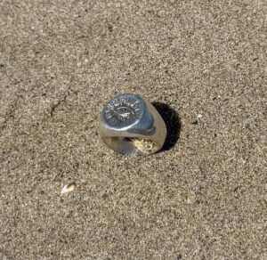 Huntington Beach is groomed nightly with beach sifting machines. I thought we might have a chance because this area was what we call no-man’s land. ( Center area of the beach between board walk and towel line ).. After 3 hours of grid searching Jose’s silver ring showed up in my scoop.. I met him after he got off work to return his ring.