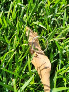 Tim’s truck appeared shortly. I let him tell me the story. He showed me where he was standing when the ring came off his hand. His account, the circumstances and trajectory all aligned forensically with the ring’s hiding place. I leaned over and pointed to the spot under the fence where the ring had come to rest. Then I opened my hand to reveal Tim’s precious ring. Tim was both shocked and overjoyed!