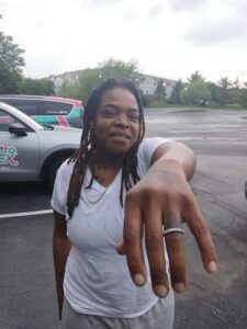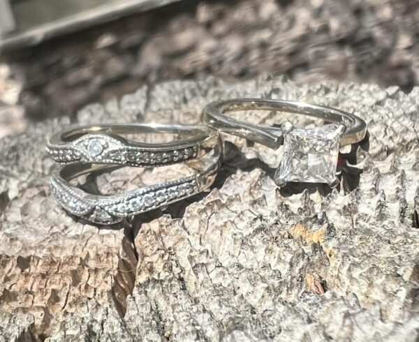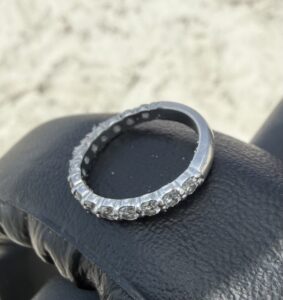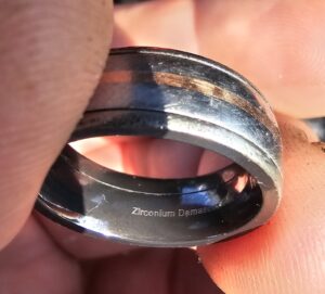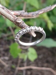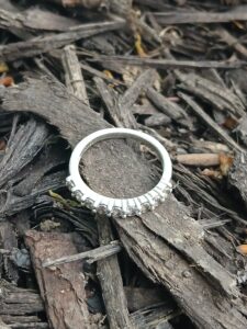 Terry, like all of us have, was feeling the frustrations of life. In a moment of lasps the ring was taken off and thrown. Thrown into one of the worst locations, filled with trash and landscaping debris. She immediately regretted this……She tried to find it. Many times returning to the spot, sliding down the steep hill in desperation. She even bought a metal detector, grasping at anything she could do to find her ring. She finally ended up on the internet. Theringfinders.com was her best hope. After hours of searching through the rough terrain her ring is back where it belongs. Always an honor to help someone get back such an irreplaceable item.