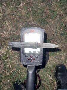 We walked and searched approximately 30 minutes and as sun was setting I explained that I often search in late afternoons and I have had luck in parks finding things around sunset. Something about the dark gives me favor. Sure enough as we were walking towards our vehicles and swinging my detector in last ditch efforts my detector sounds off. Although under moonlight I could see the outline of a knife. I asked Tim, “remember what I said earlier about finding stuffs in the dark? There it is!” He didn’t believe me until I picked it up and placed into his hand. 🙂