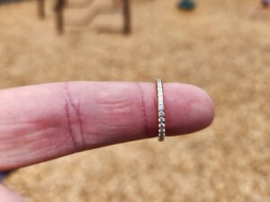 Robin texted me one evening explaining that her daughter had taken her beautiful wedding band (rose gold with diamonds) to a playground with her. She goes on to explain that the ring was then lost in the woodchips and remained at large. She was looking for an individual with a metal detector to help find it.