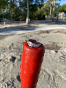 In the photos above a couple was laying out in their communities private beach and lost his ring. Similar to 100 other recoveries that I’ve done it was placed on a towel and when the towel was used to dry off, the Ring went flying. Once a ring hits the sand it’s almost impossible to find because the more you look for it the deeper it goes. After Not being able to find it, they came across my information and gave me a call. I was able to go out and help him find it. We moved a bunch of the chairs around and there it was.
